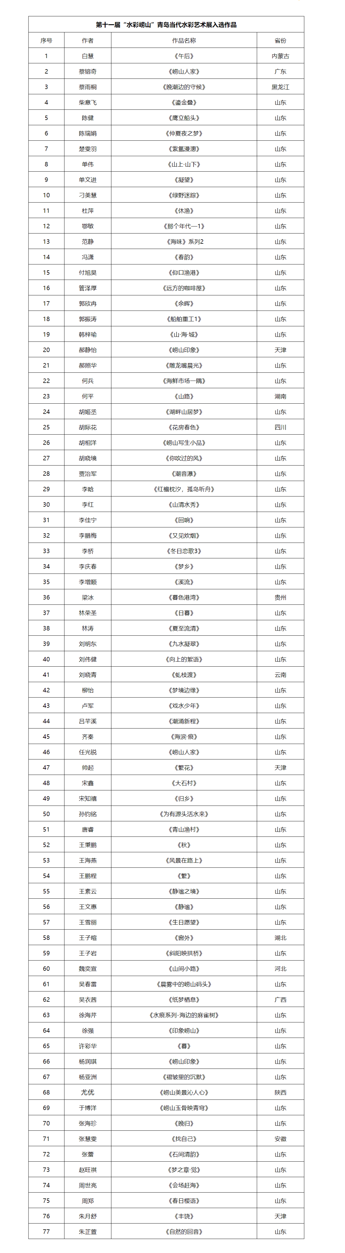 第十一届“水彩崂山”青岛当代水彩艺术展历时近三个月的征稿,收到来自全国18个省、自治区、直辖市的水彩作品近200幅,经过组委会严格公正评选,共有77件作品入选(名单附后)。