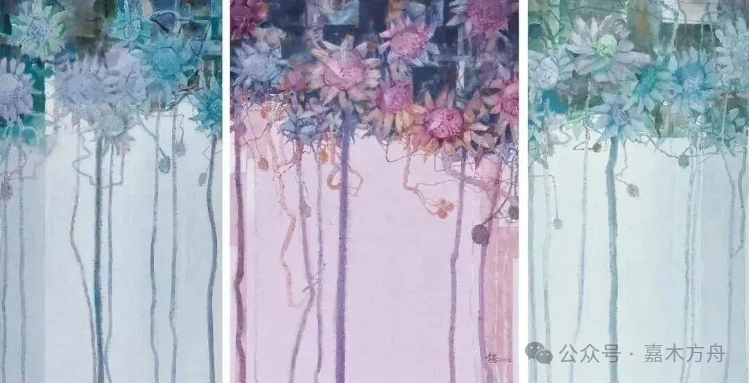 她用的是水彩。水彩的好处是轻、是透、是能留住那一口“气”。她不追求工细,也不故意写拙。调色偏淡,却不寡淡。紫是紫,粉是粉,绿是绿,每种颜色都像是花里自己生将出来的,不是抹上去的。水在纸上蔓延,颜色跟着水走,有时漫开、有时聚拢,她都由着它。这有点像中国画里的“写意”,只不过,她是拿水彩写的。