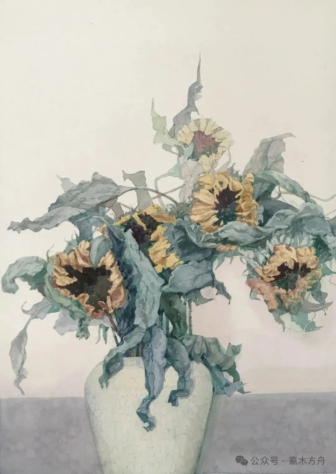 她好像尤其喜欢画那些快要凋谢的花。画过一株向日葵,花盘低垂,花瓣不再鲜亮,边缘泛出淡褐色,像是晒够了太阳,终于能歇一歇。茎秆弯了,还没断。背景是一面灰墙,墙上映着一抹斜斜的光。这向日葵不是那种昂首挺胸的英雄,反倒像个刚归家的旅人,满身风尘,却还带着笑意。