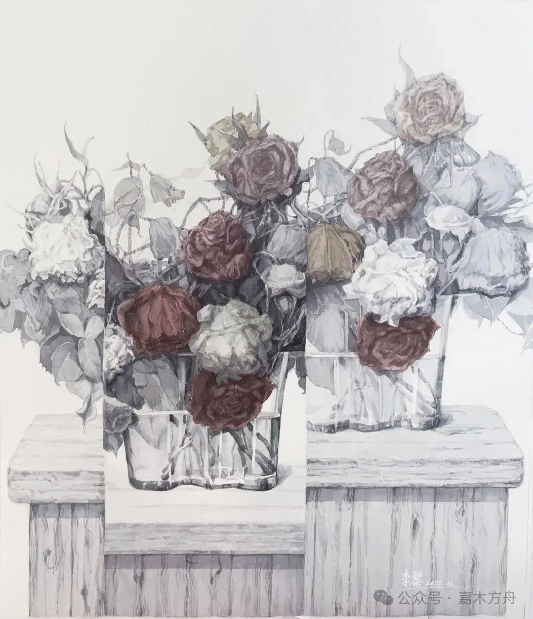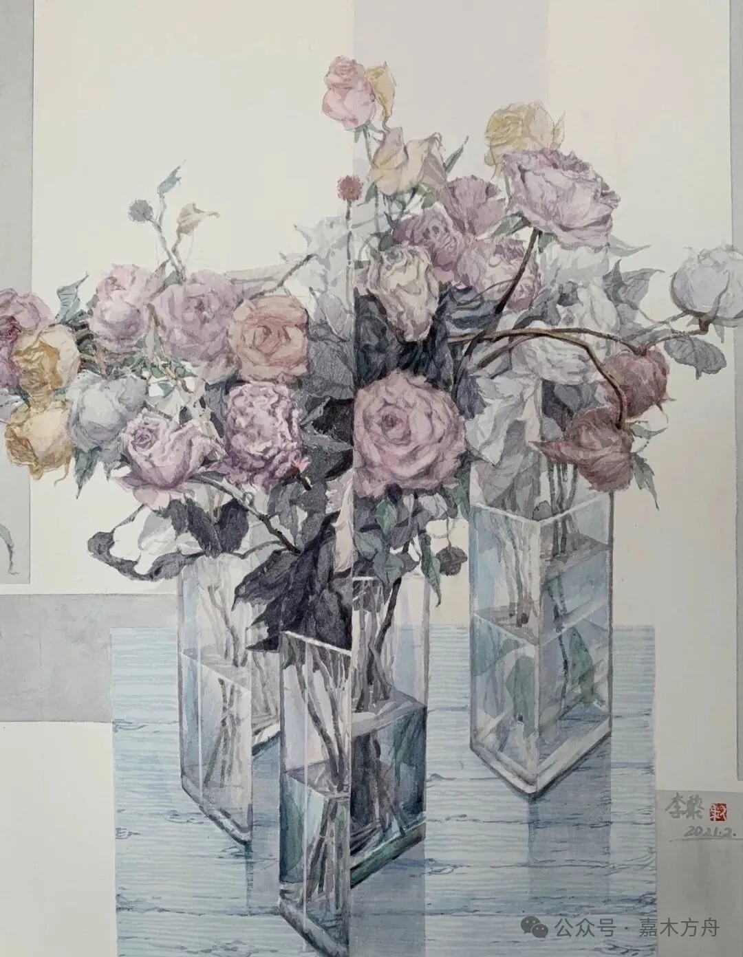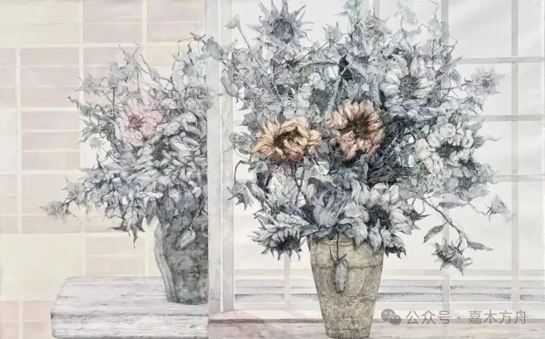 她也画那些卷了、淡了、甚至已经掉在桌上、瓶口的残瓣,不扫、不遮、不整容,就让它们素面留在原处。她说:“凋谢也是花的一部分。”这话朴素,却有味道。画下来,便是“荣枯皆入画”。她不避讳衰败,也不刻意修饰,她就是如实去画——花开着,也谢着;水清着,也浊着;光移着,也淡着。这一切,都是生活本来的样子。
