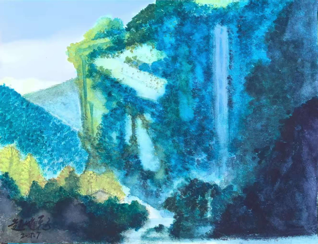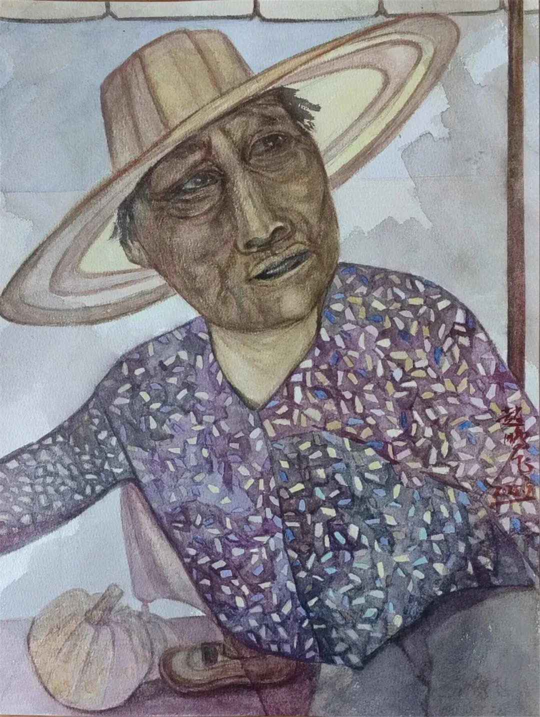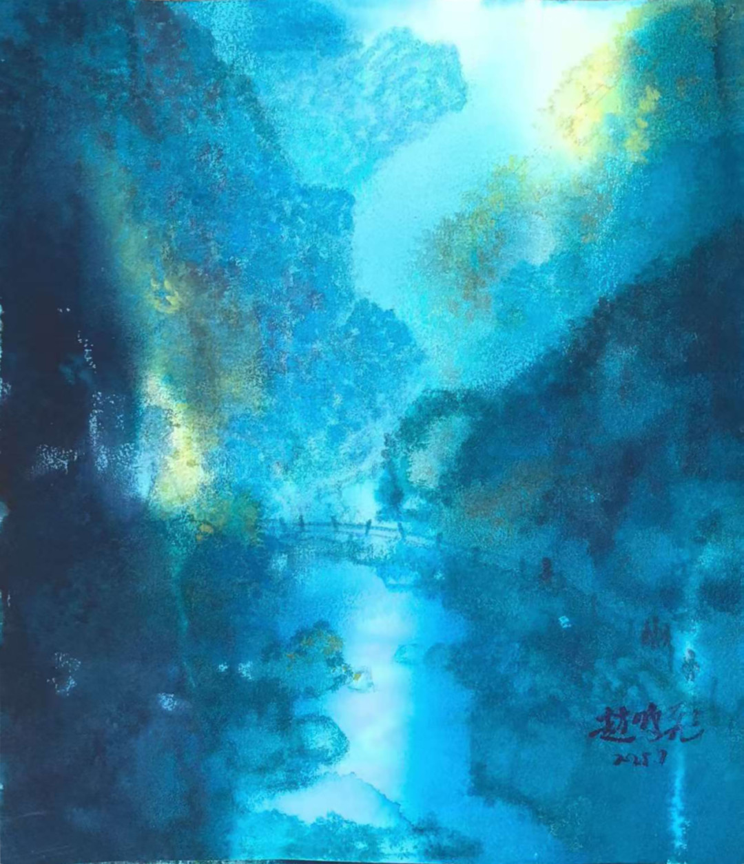 他注重对画面水与色的掌控。创作中,他不刻意追求轮廓的极致清晰,而是借助水分的晕染,让色彩自然交融、渐变,形成柔和的过渡效果。淡彩铺陈时,画面如薄雾般轻盈,尽显空灵意境;重彩点染处,又不失色彩的饱和与张力,却无厚重压抑之感。水色的偶然晕散与刻意把控相互平衡,既保留了水彩的 “偶然性” 魅力,又通过精准的笔触引导,让画面始终围绕主题展开,避免了水色失控的杂乱,尽显创作功底。