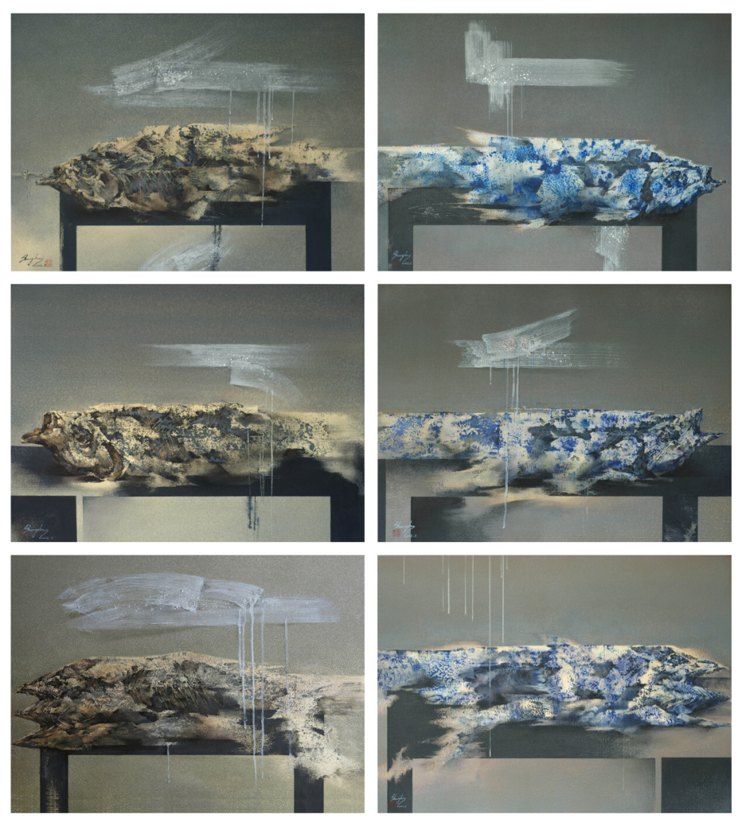 鱼,邵昱皓创作中贯穿始终的核心载体,也是他叩问生命本质、探寻文化根脉的重要媒介。“鱼是承载我人生不同阶段感想的载体”,他曾这样解读自己的创作。2008年,他将创作视角定格于干鱼,撞开了艺术表达的闸门,借笔下的干鱼,倾诉对生命脆弱性的追问。后来,《青花鱼》系列的诞生,让“鱼”挣脱了单纯的生命意象,走进了文化语境——此时的鱼,是东方符号,是文化身份象征。他坦言:“我还会继续画鱼,但它们会更‘自由’。鱼从‘被观看的客体’转变为‘主动提问的主体’,我也会从‘画鱼’变成‘借鱼问水’。”