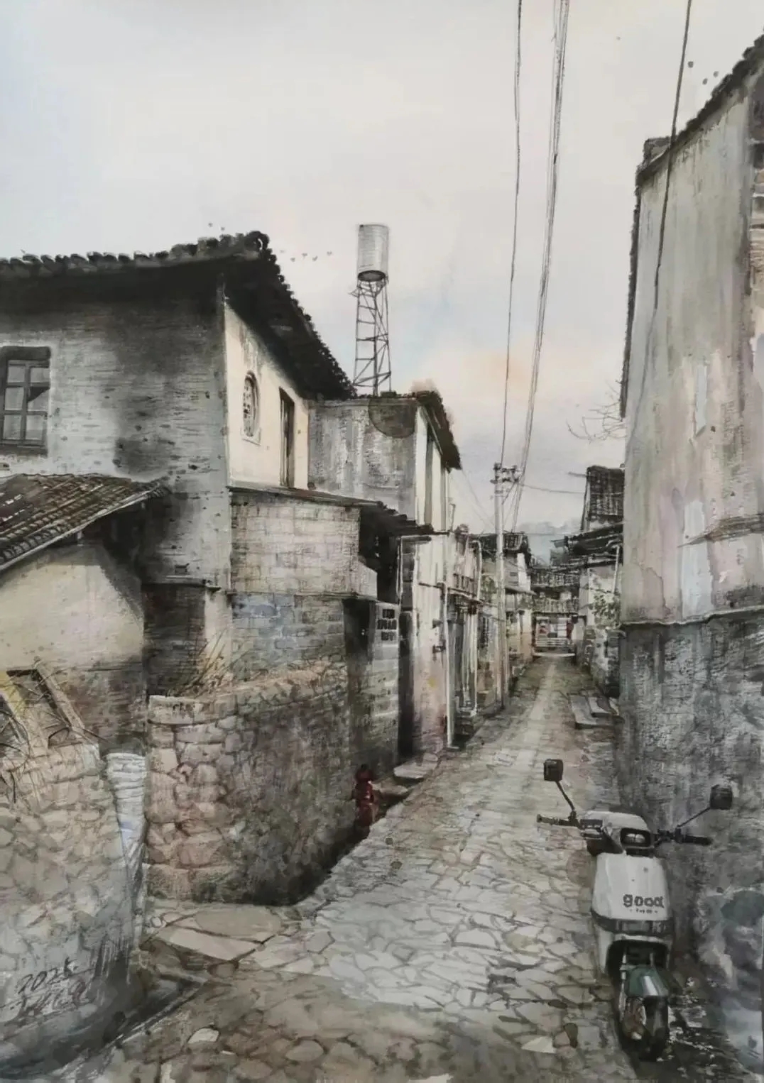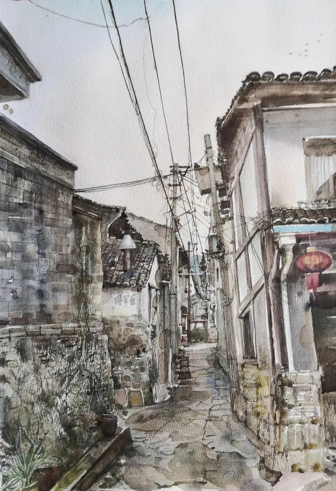 《芙蓉古村》系列作品以细腻的笔触和淡雅的色彩呈现了古街小巷浓郁的生活气息与历史韵味。斑驳的墙面、老旧的瓦片到古朴的门窗,恰到好处地晕染出建筑历经岁月洗礼的沧桑感,使观者能深切感受到古街的厚重历史。电线、灯笼等生活元素的点缀,为画面增添了鲜活烟火气。