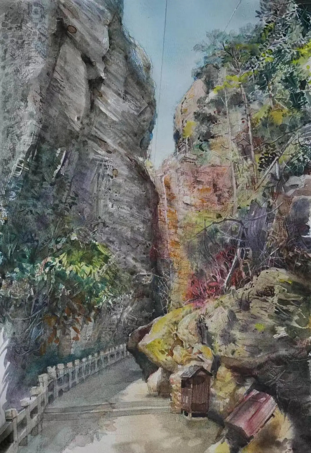 水彩艺术以其透明轻快的特质,在表现自然山水方面具有独特的优势。在他的《春晓雁荡》《大龙湫》描绘山川的作品中,充分彰显了这一点。画家对山体岩石质感的刻画细腻入微,通过色彩的深浅变化与水痕的自然晕染,将岩石的坚硬与沧桑表现得淋漓尽致。在色彩运用上,巧妙调配出契合山体特征的色调,或冷峻灰褐,或在光影处呈现出微妙的基调,使山体在画面中极具厚重之美。