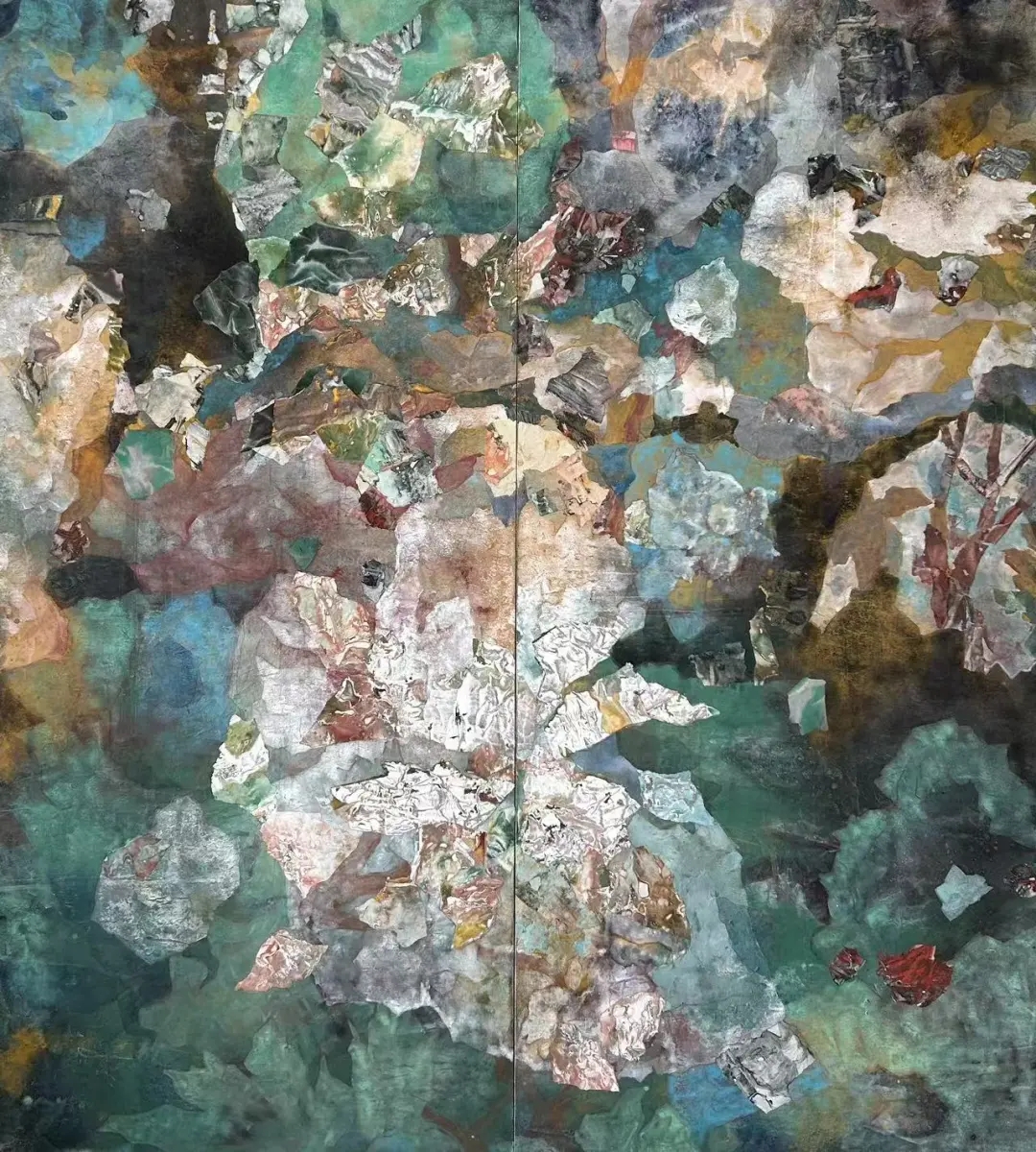 王玉娟是个“守着老手艺往前挪”的人。她从油画追溯到坦培拉,然后盯着“综合材料”往漆艺里钻。这门老工艺要“一涂二晾三磨”,她磨来磨去,多的是不确定性。而她的作品却把大漆材料的不确定性转为了确定的丰富质感,把大漆的温润和综合材料的粗粝狠狠的混在一起,作品的呈现多元且极具空间魅力,既有大女人的爽利又有小女人的柔情。她这次带来的作品,仍围着“大漆+综合材料”转。漆液与金属箔的碰撞与渗透,如同灵魂与躯体的交融,箔上的薄漆打磨后,箔的亮从漆里透出来,像是“老木头里藏着的星星”。她不是为了创新而创新,而是想告诉观者,艺术创作的边界无限宽广,传统工艺和现代材料共生共叙,很美好。