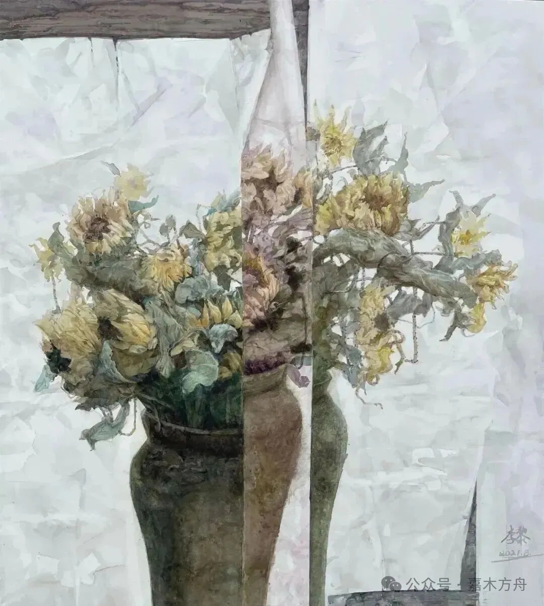 她好像尤其喜欢画那些快要凋谢的花。画过一株向日葵,花盘低垂,花瓣不再鲜亮,边缘泛出淡褐色,像是晒够了太阳,终于能歇一歇。茎秆弯了,还没断。背景是一面灰墙,墙上映着一抹斜斜的光。这向日葵不是那种昂首挺胸的英雄,反倒像个刚归家的旅人,满身风尘,却还带着笑意。