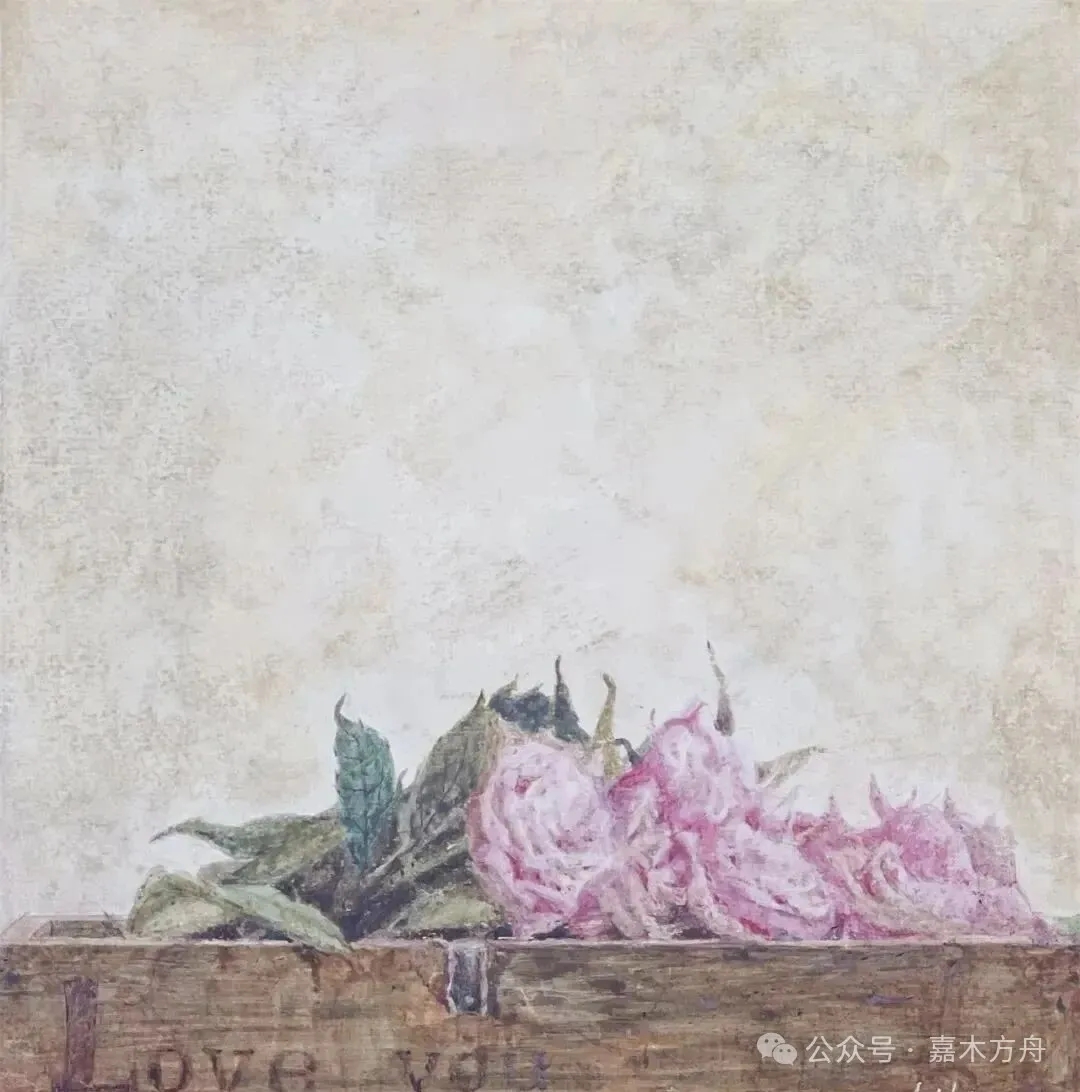 她画花,也画瓶、画案、画光。陶罐是用了很久的,釉色斑驳;玻璃瓶清澈,映出窗外的天光;木箱上了年纪,边角露出木头的纹理。她不给“修旧如新”,也不硬凹“古意”,她就画它们此时的样子。花插在里面,不像被供着,倒像是自然生长在那里。光,从某个角度斜斜地照进来,落在花瓣上,映在瓶身上,也照亮案头一角。她就这么把光也画进去,不浓不淡、不急不缓。