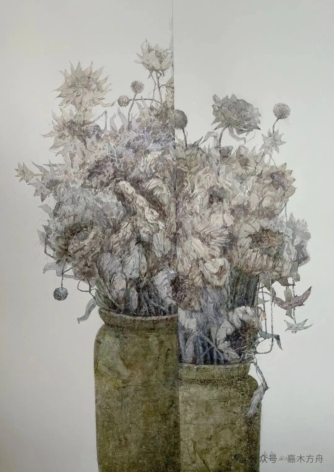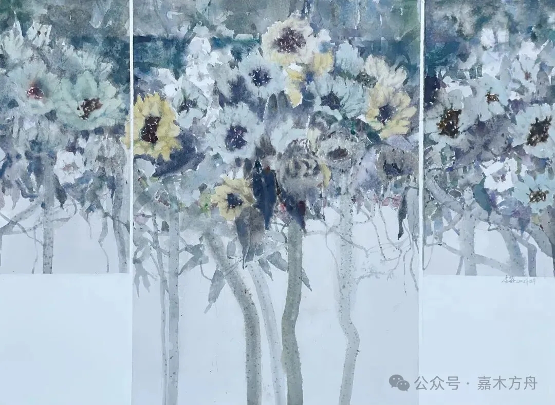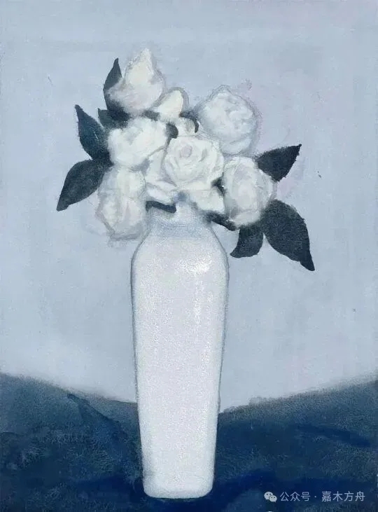还画过一枝白花,插在白瓷瓶里,背景是极淡的灰,淡到几乎看不见。整幅画安安静静,像一声没叹出来的气息,又像一句低低的问候。花与叶,不声张、不热闹,可它就在那儿,已经足够美好。