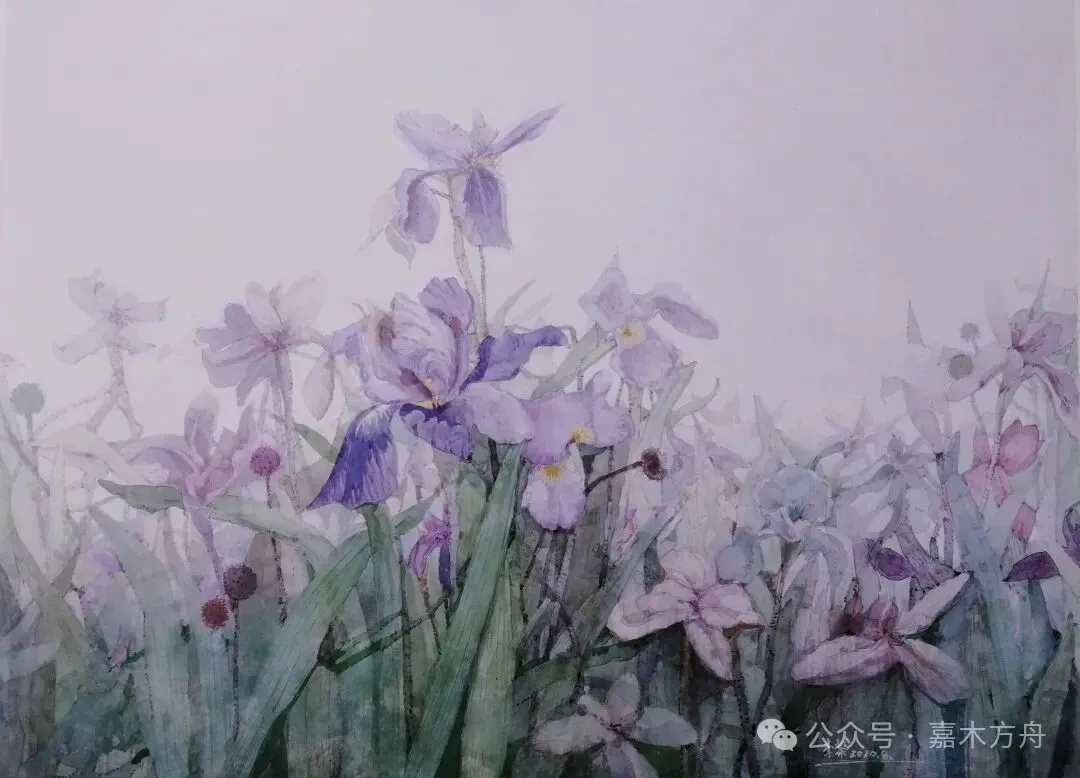 她用的是水彩。水彩的好处是轻、是透、是能留住那一口“气”。她不追求工细,也不故意写拙。调色偏淡,却不寡淡。紫是紫,粉是粉,绿是绿,每种颜色都像是花里自己生将出来的,不是抹上去的。水在纸上蔓延,颜色跟着水走,有时漫开、有时聚拢,她都由着它。这有点像中国画里的“写意”,只不过,她是拿水彩写的。