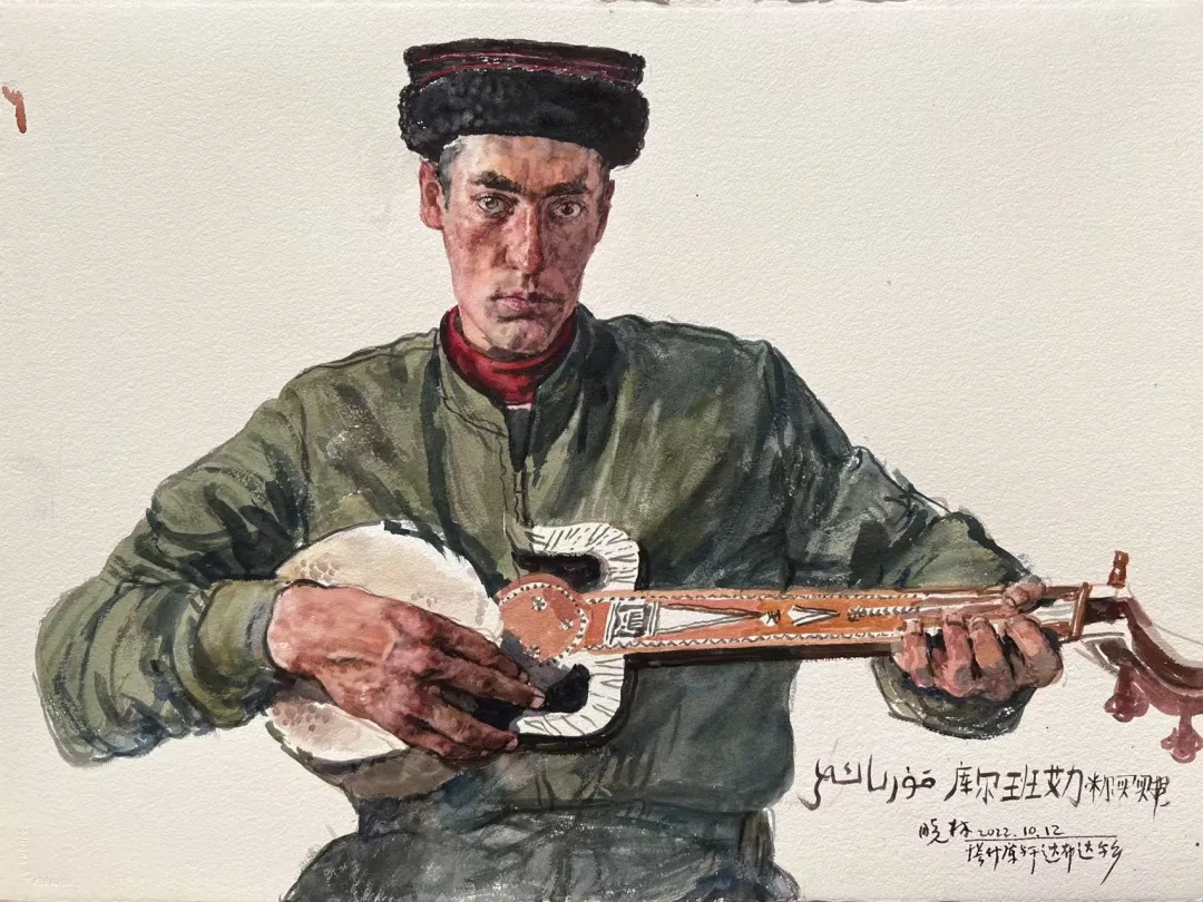 李晓林 《弹热瓦普的库尔班-艾力》 76×57cm 水彩 2022年