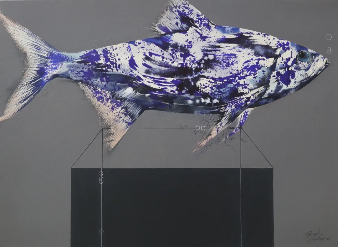 鱼,邵昱皓创作中贯穿始终的核心载体,也是他叩问生命本质、探寻文化根脉的重要媒介。“鱼是承载我人生不同阶段感想的载体”,他曾这样解读自己的创作。2008年,他将创作视角定格于干鱼,撞开了艺术表达的闸门,借笔下的干鱼,倾诉对生命脆弱性的追问。后来,《青花鱼》系列的诞生,让“鱼”挣脱了单纯的生命意象,走进了文化语境——此时的鱼,是东方符号,是文化身份象征。他坦言:“我还会继续画鱼,但它们会更‘自由’。鱼从‘被观看的客体’转变为‘主动提问的主体’,我也会从‘画鱼’变成‘借鱼问水’。”