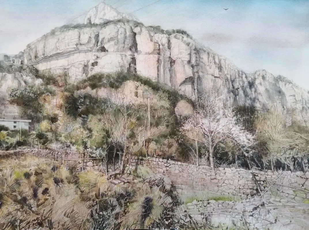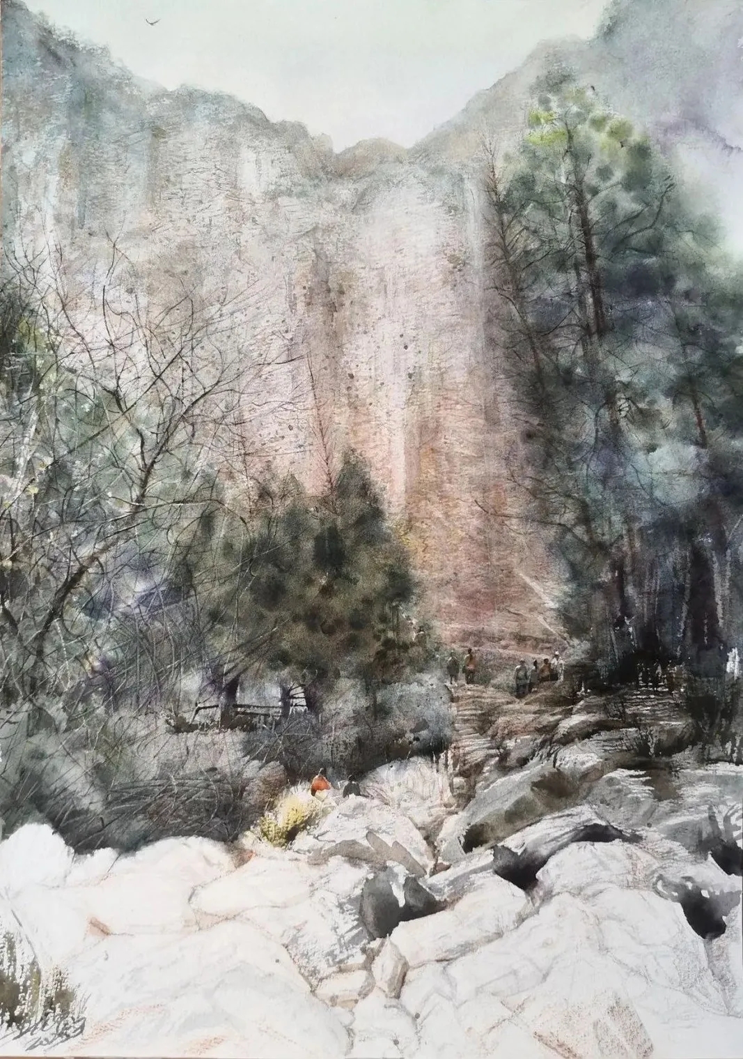 水彩艺术以其透明轻快的特质,在表现自然山水方面具有独特的优势。在他的《春晓雁荡》《大龙湫》描绘山川的作品中,充分彰显了这一点。画家对山体岩石质感的刻画细腻入微,通过色彩的深浅变化与水痕的自然晕染,将岩石的坚硬与沧桑表现得淋漓尽致。在色彩运用上,巧妙调配出契合山体特征的色调,或冷峻灰褐,或在光影处呈现出微妙的基调,使山体在画面中极具厚重之美。